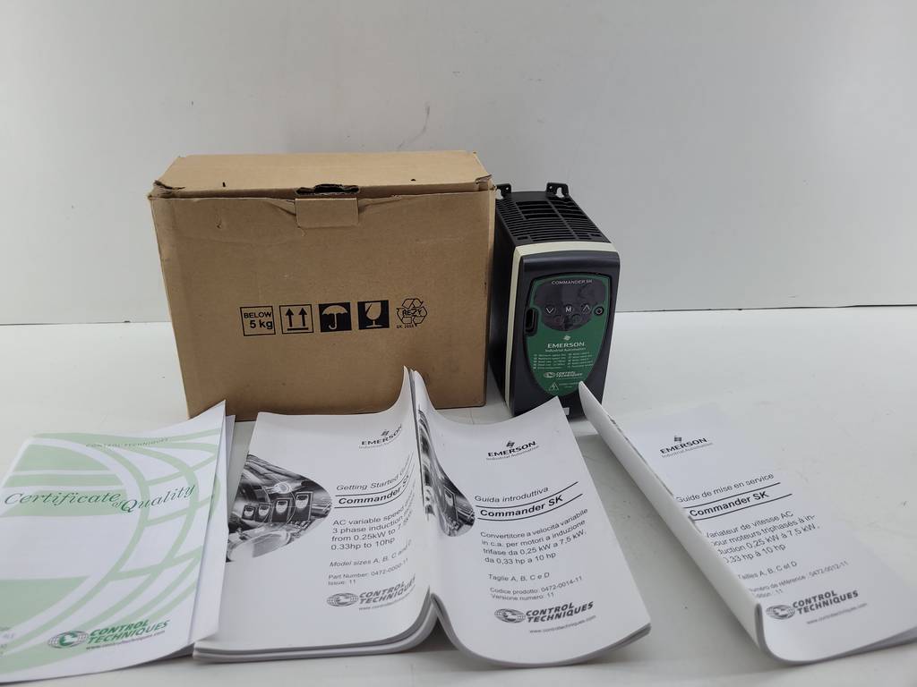 Variador de frecuencia de la marca Emerson modelo Commander SK que se encuentra completo con instrucciones y caja,